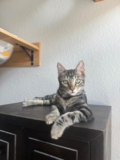 Meet Millie - Pretty and a Little Bit Mysterious Millie is a shy sweetheart with big, beautiful eyes and a coat that looks like it was painted by angels. She's still figuring things out, but don't let her quiet vibe fool you-she secretly enjoys a good cuddle and a sneaky play session when the mood strikes.She's a litter box pro, totally chill about being held, and seems to get along fine with other cats. Right now, she's more of an "upstairs queen" who prefers to observe from her throne while she gets comfortable.If you're looking for a gentle kitty with a soft heart and a side of mystery, Millie's your girl.