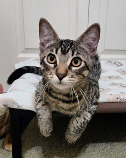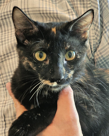 Meet Spot - A Dash of Gold and a Whole Lot of Love!Spot is a one-of-a-kind kitten with a sleek black coat kissed by golden patches and speckles-like little stars scattered across the night sky. At 6 months old, she's bursting with playful energy, curiosity, and just the right amount of sass.Though a little shy at first, Spot has a sweet and affectionate side that shines through once she feels safe. She adores side scratches, and once you earn her trust, she'll reward you with the best gift of all: nonstop biscuit-making with her happy little paws. Its her way of saying, "I'm comfy, I like you, and I'm home."Spot loves chasing wand toys, batting around stuffed mice, and exploring every corner of the room. She's full of kitten mischief in the best way and would thrive in a home that gives her space to play and time to warm up.She gets along well with other cats and could really blossom in a home with a friendly feline companion. Spot hasn't met children yet, but would likely do well in a calm, patient household where she can continue to build her confidence.Spot is ready for her forever home-one with cozy spots, caring people, and plenty of time to grow into the loving, lively cat she's meant to be. Adopt Spot and add a little sparkle to your life-one biscuit at a time.
