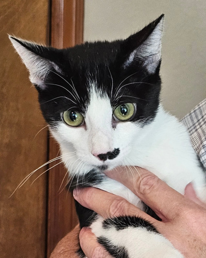 Meet Kaysee - The Independent Explorer with a Playful Heart!Kaysee is a striking black-and-white short-haired kitten with a personality as bold as his markings. He's got energy to spare, a sharp little mind, and a deep love for all things play-especially stuffed mice and wand toys!While Kaysee can be a bit shy when meeting new people, his curiosity always wins out. Give him a little time and space, and you'll start to see the true Kaysee emerge: playful, inquisitive, and totally entertaining. He's not a lap cat (yet!), but he's the kind of companion who's happiest doing his own thing-chasing toys, exploring corners, and darting through sunbeams.Kaysee plays well with other cats and would do great in a home with a feline friend to help him feel more confident. He hasn't been around children, but a calm and patient home would be ideal to help him settle in at his own pace.Kaysee is ready to bring some joyful chaos and quiet companionship to the right forever home. Looking for a playful, independent spirit to keep you on your toes? Kaysee is ready to explore life with you!
