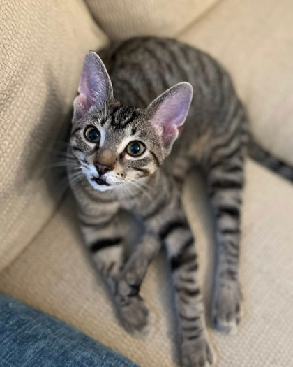 Meet Cacio! Cacio is a soft marbled tabby who has two modes - playing and cuddling. Let this little boy go wild with a feather and he will reward you in equal quantities of love and purrs. Cacio would do really well in a house with someone- anyone!- that is willing to throw toys, dangle a feather, or have an occasional wrestling match. Dogs are alright, but other cats are his favorite! Cacio is a litter box pro and a great eater! If you're looking for an adventurous playful little boy, Cacio may just be your new best friend!