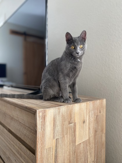 Meet Nova - Shoulder Cat, Wall Bouncer, and Professional Snuggler.Nova's life has been one big adventure since she was a tiny neonatal bottle baby. She's a survivor with a slightly blurry eye (three surgeries later), daily tears, and a chronic case of the sniffles. Don't worry-she blows snot like a champ, and you'll learn to duck.She's part daredevil, part shadow. Nova has no fear. Zero. Zilch. If she met a tiger, she'd probably ask it to share snacks. She's also clingier than your favorite hoodie and where you go, she goes. Bathroom trips? She's there. Midnight snacks? Already in the kitchen.Her hobbies include shoulder snuggling like a pirates parrot, bouncing off walls mid-zoomie (literally), playing with every toy she finds and never putting it back, and being generally just extra.Nova is looking for a human with experience caring for special cats and who's cool with a little extra maintenance: quick daily eye wipes, a few drops of saline, and a lot of snuggles. In return, you'll get a fearless, hilarious, endlessly loyal cat who proves that special needs just means "extra special."