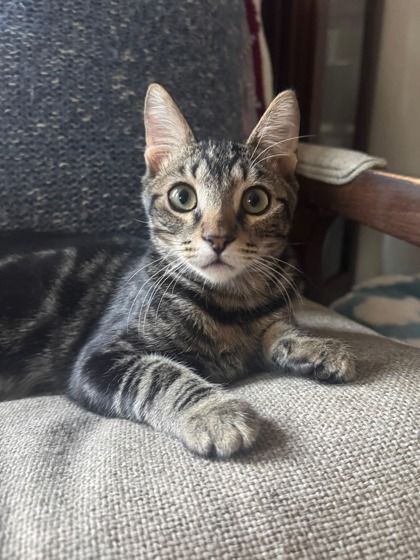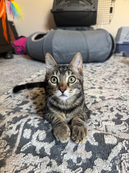 Meet Cacio! Cacio is a soft marbled tabby who has two modes - playing and cuddling. Let this little boy go wild with a feather and he will reward you in equal quantities of love and purrs. Cacio would do really well in a house with someone- anyone!- that is willing to throw toys, dangle a feather, or have an occasional wrestling match. Dogs are alright, but other cats are his favorite! Cacio is a litter box pro and a great eater! If you're looking for an adventurous playful little boy, Cacio may just be your new best friend!