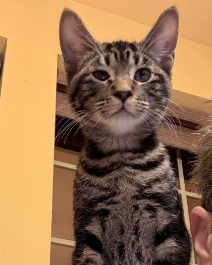 Klaus is a striking gray and black tabby kitten with a big heart and an even bigger personality. His favorite place to be is perched right on your shoulder, where he can purr in your ear, watch the world go by, and make sure you're never lonely.This sweet boy is both playful and cuddly. He loves chasing toys, wrestling with his feline friends, and zooming around the room - but just as much, he adores curling up in your arms for snuggles. Klaus is wonderfully social and gets along great with other cats and even dogs, making him an easy fit for a multi-pet household.Klaus thrives on companionship and loves being part of the action. Whether he's riding on your shoulder, cuddling on the couch, or making new animal friends, he brings joy wherever he goes. If you're looking for a friendly, affectionate kitten who will happily be your little sidekick, Klaus is ready to steal your heart.