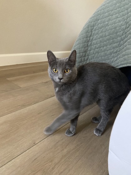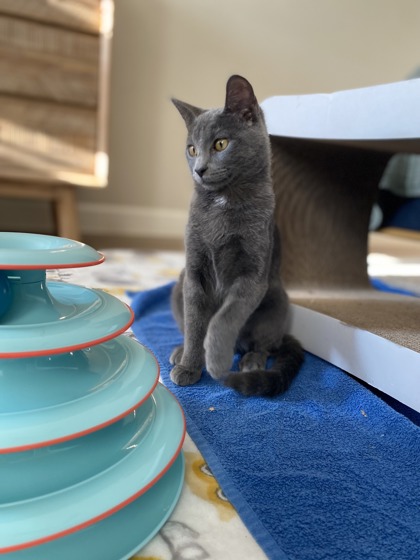 Meet Peggy! She's a sweet kitten who was rescued from the shelter, scared and unsure of the world. At first, Peggy spent most of her time hiding, but now she's learning to trust and come out of her shell. She's a curious girl who enjoys exploring the house, playing with her toys, and lounging on the cat tree for naps.While Peggy has made great progress, she's still shy about being touched or held, but she's learning, especially when treats are involved! She finds comfort in the company of other cats and would do best with a friendly cat or kitten companion to bond with and feel safe. She would also do best in a quiet, patient home that gives her time to continue building confidence. Peggy is a gentle soul who just needs love, patience, and a safe place to truly be herself.