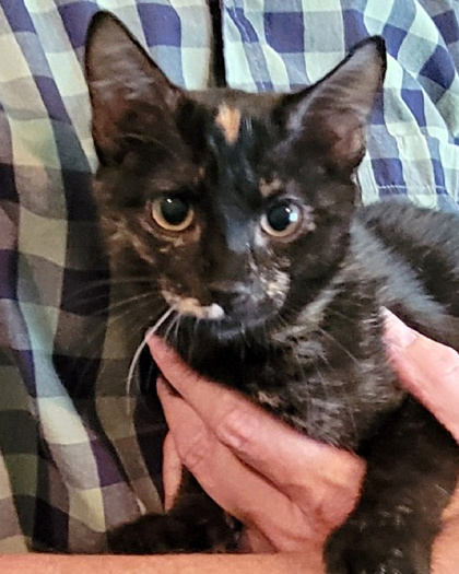 Meet Spot - A Dash of Gold and a Whole Lot of Love!Spot is a one-of-a-kind kitten with a sleek black coat kissed by golden patches and speckles-like little stars scattered across the night sky. At 6 months old, she's bursting with playful energy, curiosity, and just the right amount of sass.Though a little shy at first, Spot has a sweet and affectionate side that shines through once she feels safe. She adores side scratches, and once you earn her trust, she'll reward you with the best gift of all: nonstop biscuit-making with her happy little paws. Its her way of saying, "I'm comfy, I like you, and I'm home."Spot loves chasing wand toys, batting around stuffed mice, and exploring every corner of the room. She's full of kitten mischief in the best way and would thrive in a home that gives her space to play and time to warm up.She gets along well with other cats and could really blossom in a home with a friendly feline companion. Spot hasn't met children yet, but would likely do well in a calm, patient household where she can continue to build her confidence.Spot is ready for her forever home-one with cozy spots, caring people, and plenty of time to grow into the loving, lively cat she's meant to be. Adopt Spot and add a little sparkle to your life-one biscuit at a time.